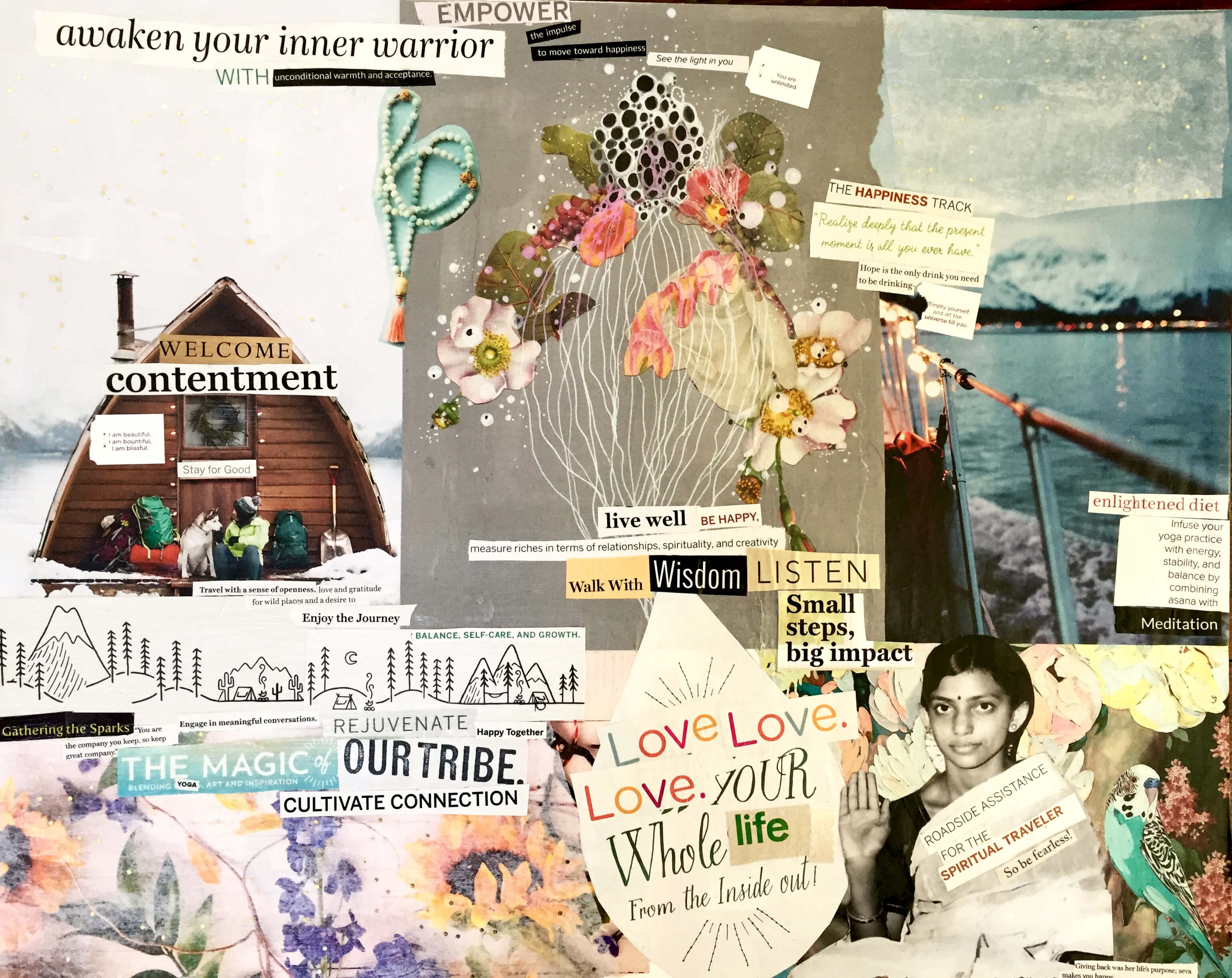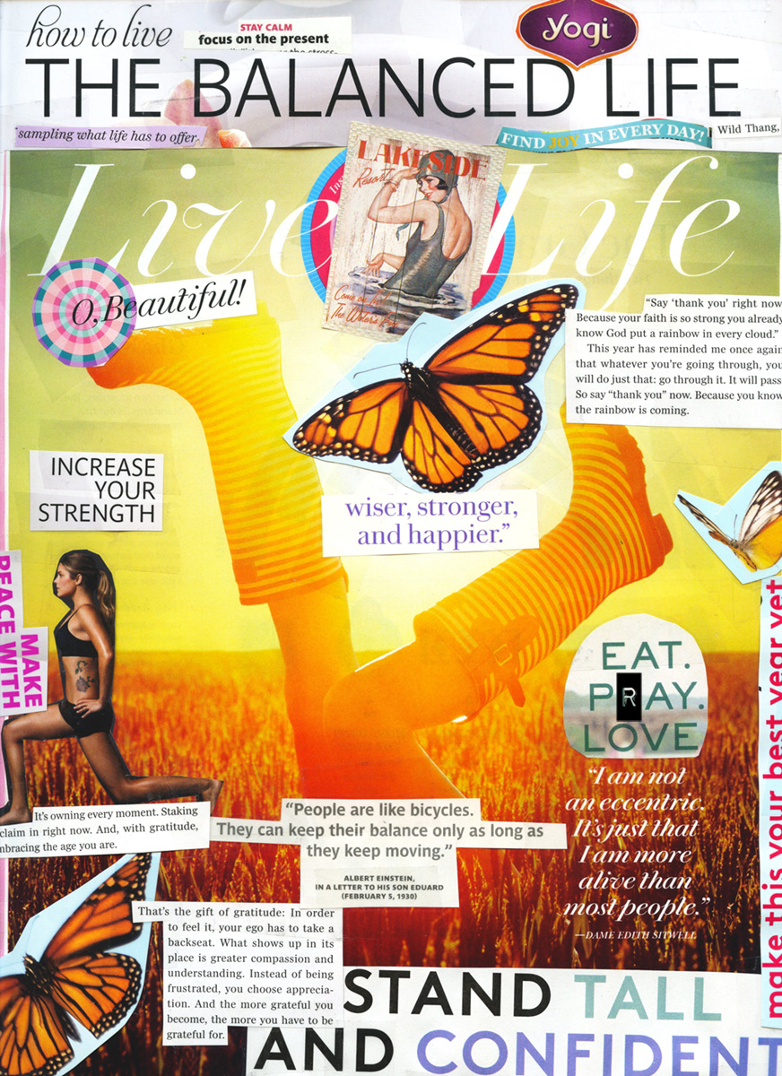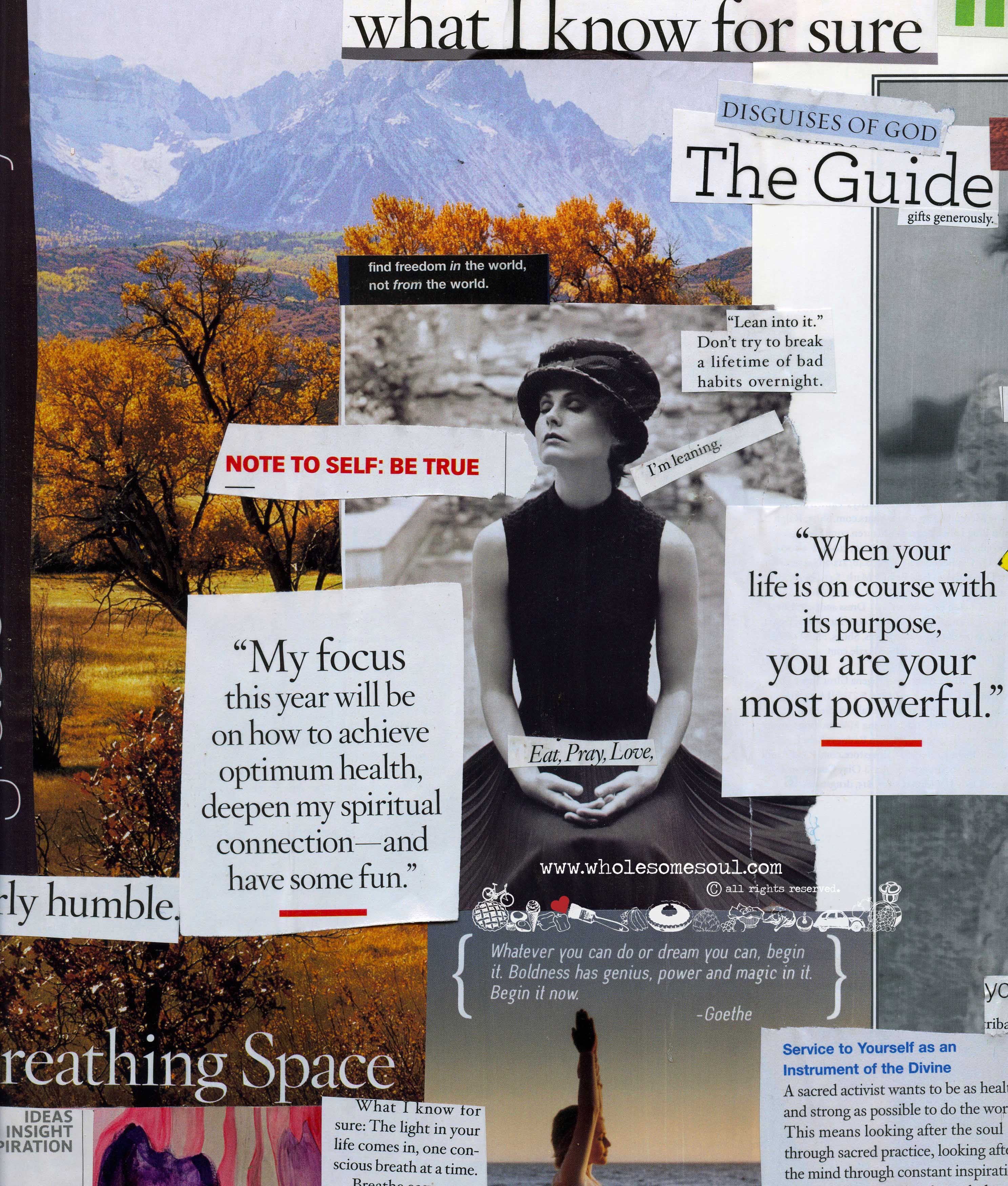 What I love about this process is that there is something so calming, organic and grounding about it. I try not to start with any pre-defined ideas and instead allow myself to get lost in a pile of favorite magazines and my box of “things I love” (i.e. tea bag quotes, old cards, newsletter snippets, inspiring articles, etc, etc). After a few hours of ripping and snipping out things I’m drawn to, I sit down with a blank canvas and start arranging the words and images. And slowly, without a doubt, my deepest longings come to the surface.