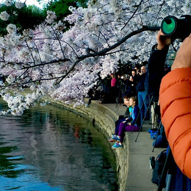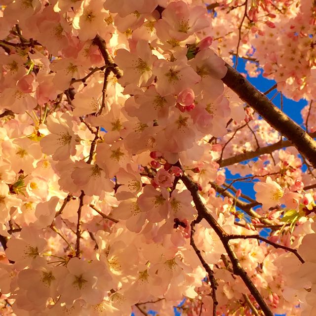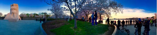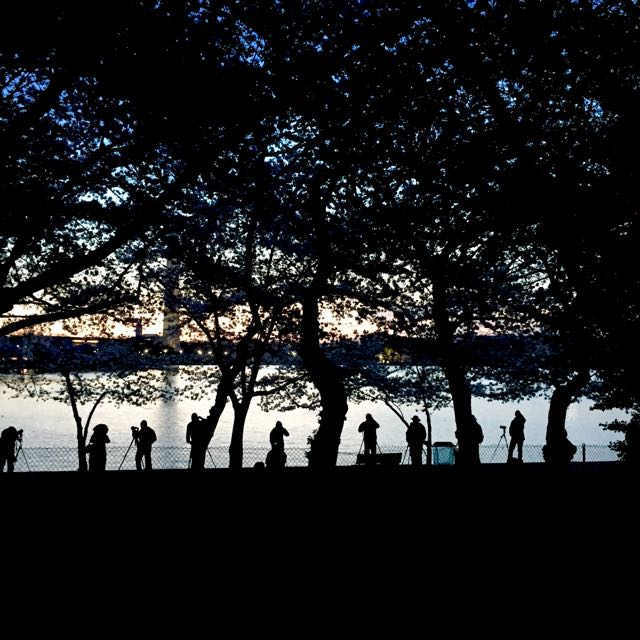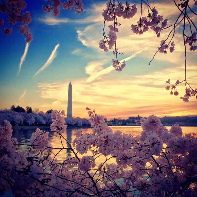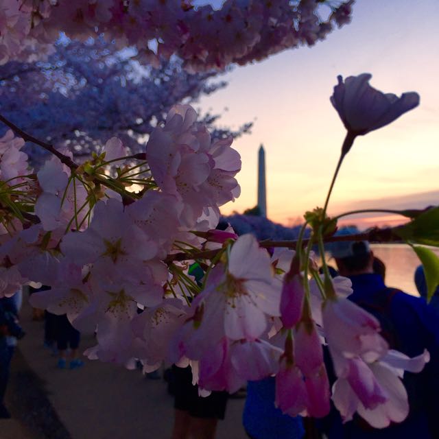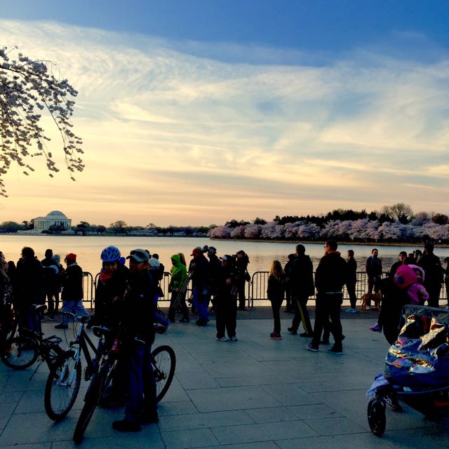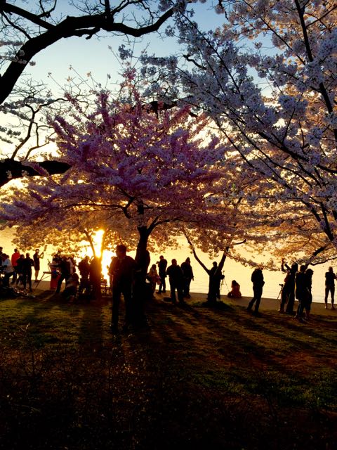 This past weekend, my family and I got up early to be a part of the great Cherry Blossoms viewing. These gifted beauties circle the full radius of the Tidal Basin in DC, and boy are they gorgeous! We got there before sunrise so we had the opportunity to enjoy them in a few different lights; at dawn they silhouetted the sky, at sunrise they sparkled and once the sun was fully out they glowed with an iridescent pink, purple and white effect.